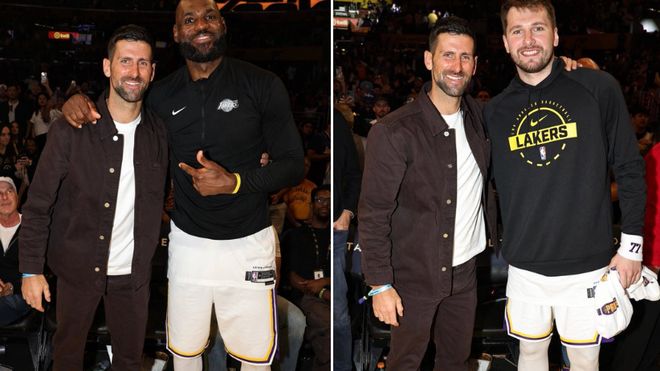 德約科維奇不僅去了東契奇的派對,賽前也現場觀戰了湖人比賽——在湖人主場和詹姆斯、東契奇在場邊合影。